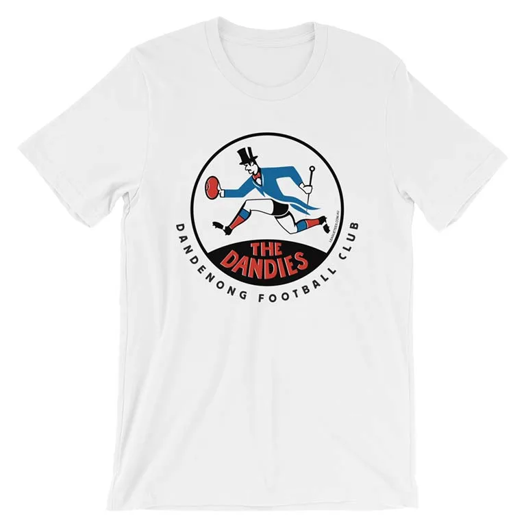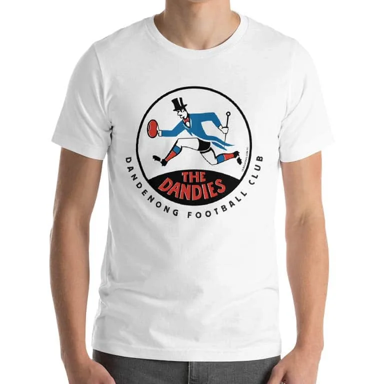 A tribute to Dandenong’s finest. Despite their foppish name, the Dandies were renowned for their rugged fight. Filtering in from the south-east Federal League to the VFA in 1958, the dapper Dandies became a finals force in the 1970s. Sadly Dandenong were a victim of financial folly and footy’s 1990s rationalisation. Reborn as they Redlegs, the senior club finally folded in 1995. Read more about them at the excellent Australian Football website. This tee is based on a 60s design we dug up. We’re not sure if it was used officially alongside the club’s distinctive gloves, can and top hat crest. Please give us a yell if you know more.